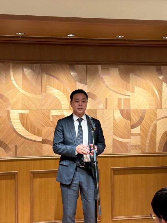 セミナー後の交流会で挨拶する岩田副支部長です。その中で「人とのつながりを大切にすること、そして楽しみながら事業を行うこと」を呼びかけ参加された皆様との交流を深めました。1時間半の間に岩田副支部長には多くの質問が寄せられ、それに真摯に答える姿が印象的でした。大変すばらしく有意義な交流会でした。